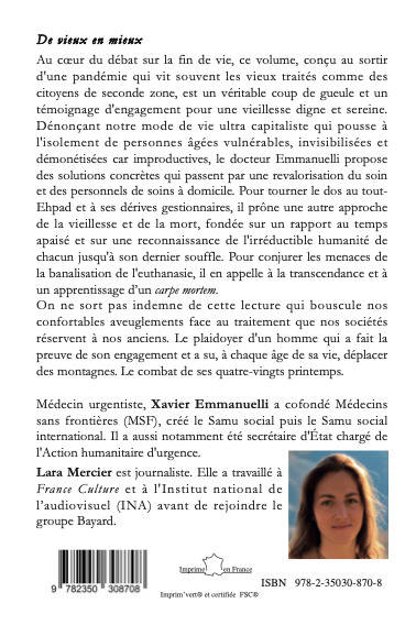 Au cœur du débat sur la fin de vie, ce volume conçu au sortir d'une pandémie qui vit souvent les vieux traités comme des citoyens de seconde zone, est un véritable coup de gueule et un témoignage d'engagement pour une vieillesse digne et sereine. Dénonçant notre mode de vie ultra capitaliste qui pousse à l'isolement de personnes âgées vulnérables, invisibilisées et démonétisées car improductives, le docteur Emmanuelli propose des solutions concrètes qui passent par une revalorisation du soin et des personnels de soin à domicile. Pour tourner le dos au tout-Ephad et à ses dérives gestionnaires, il prône une autre approche de la vieillesse et de la mort, fondée sur un rapport au temps apaisé et sur une reconnaissance de l'irréductible humanité de chacun jusqu'à son dernier souffle. Pour conjurer les menaces de la banalisation de l'euthanasie, il en appelle à la transcendance et à un apprentissage d'un carpe mortem. On ne sort pas indemne de cette lecture qui bouscule nos confortables aveuglements face au traitement que nos sociétés réservent à nos anciens. Le plaidoyer d'un homme qui a fait la preuve de son engagement et a su, à chaque âge de sa vie, déplacer des montagnes. Le combat de ses quatre-vingt printemps.
