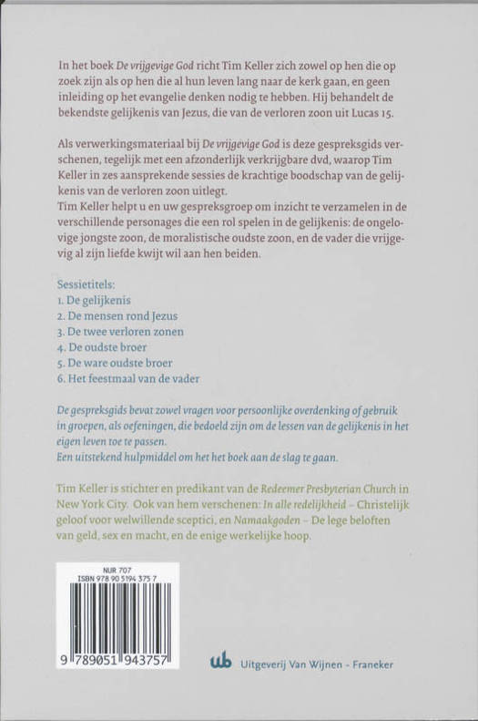 Tim Keller helpt u en uw gespreksgroep om inzicht te verzamelen in de verschillende personages die een rol spelen in de gelijkenis: de ongelovige jongste zoon, de moralistische oudste zoon, en de vader die vrijgevig al zijn liefde kwijt wil aan hen beiden.