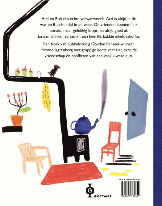 Arti en Bub zijn de wirwarwezels! Het dikke voorleesboek 'De wirwarwezels' van tweevoudig Gouden Penseel-winnares Yvonne Jagtenberg zit vol met grappige verhalen over de twee vrienden. Arti is altijd in de war en Bub is altijd in de weer. Gelukkig lopen alle avonturen meestal goed af, met een lekker bakkie troost: eikeltjeskoffie!
