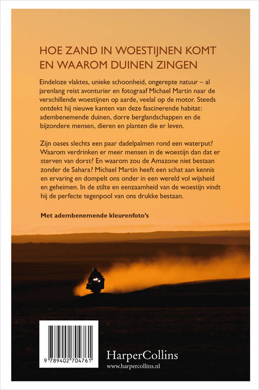 Zijn oases slechts een paar dadelpalmen rond een waterput? Waarom verdrinken er meer mensen in de woestijn dan dat er sterven van dorst? En waarom zou de Amazone niet bestaan zonder de Sahara? Michael Martin heeft een schat aan kennis en ervaring en dompelt ons onder in een wereld vol wijsheid en geheimen. In de stilte en eenzaamheid van de woestijn vindt hij de perfecte tegenpool van ons drukke bestaan.