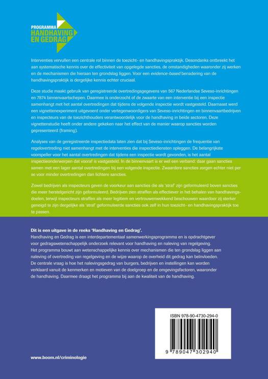 Interventies vervullen een centrale rol binnen de toezicht- en handhavingspraktijk. Desondanks ontbreekt het aan systematische kennis over de effectiviteit van opgelegde sancties, de omstandigheden waaronder zij werken en de mechanismen die hieraan ten grondslag liggen. Voor een evidence-based benadering van de handhavingspraktijk is dergelijke kennis echter cruciaal. Deze studie maakt gebruik van geregistreerde overtredingsgegevens van 567 Nederlandse Seveso-inrichtingen en 7874 binnenvaartschepen. Daarmee is onderzocht of de zwaarte van een interventie bij een inspectie samenhangt met het aantal overtredingen dat tijdens de volgende inspectie wordt vastgesteld. Daarnaast werd een vignettenexperiment uitgevoerd onder vertegenwoordigers van Seveso-inrichtingen en binnenvaartbedrijven en inspecteurs van de toezichthouders verantwoordelijk voor de handhaving in beide sectoren. Deze vignettenstudie heeft onder andere gekeken naar het effect van de manier waarop sancties worden gepresenteerd (framing). Analyses van de geregistreerde inspectiedata laten zien dat bij Seveso-inrichtingen de frequentie van regelovertreding niet samenhangt met de interventies die inspectiediensten opleggen. De belangrijkste voorspeller voor het aantal overtredingen dat tijdens een inspectie wordt gevonden, is het aantal inspectieonderwerpen dat vooraf is vastgesteld. In de binnenvaart is er wel een verband: daar gaan sancties samen met een lager aantal overtredingen bij een volgende inspectie. Zwaardere sancties zorgen echter niet per se voor minder overtredingen dan lichtere sancties. Zowel bedrijven als inspecteurs geven de voorkeur aan sancties die als ‘straf’ zijn geformuleerd boven sancties die meer herstelgericht zijn geformuleerd. Bedrijven zien straffen als effectiever in het behalen van handhavingsdoelen, terwijl inspecteurs straffen als meer legitiem en vertrouwenwekkend beschouwen waardoor zij sterker geneigd te zijn dergelijke als ‘straf’ geformuleerde sancties ook zelf in hun toezicht- en handhavingspraktijk toe te passen. Dit is een uitgave in de reeks ‘Handhaving en Gedrag’. Handhaving en Gedrag is een interdepartementaal samenwerkingsprogramma en is opdrachtgever voor gedragswetenschappelijk onderzoek relevant voor handhaving en naleving van regelgeving. Het programma bouwt aan wetenschappelijke kennis over mechanismen die ten grondslag liggen aan naleving of overtreding van regelgeving en de wijze waarop de overheid dit gedrag kan beïnvloeden. De centrale vraag is hoe het nalevingsgedrag van burgers, bedrijven en instellingen kan worden verklaard vanuit de kenmerken en motieven van de doelgroep en de omgevingsfactoren, waaronder de handhaving. Daarmee draagt het programma bij aan de kwaliteit van de handhaving.