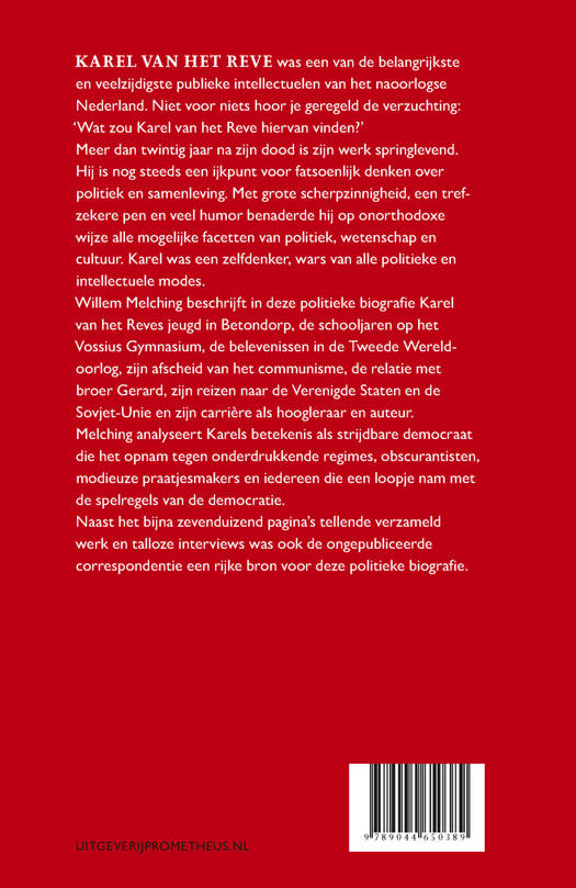 Karel van het Reve was een van de belangrijkste en veelzijdigste publieke intellectuelen van het naoorlogse Nederland. Niet voor niets hoor je geregeld de verzuchting: ‘Wat zou Karel van het Reve hiervan vinden?’ Meer dan twintig jaar na zijn dood is zijn werk springlevend. Hij is nog steeds een ijkpunt voor fatsoenlijk denken over politiek en samenleving. Met grote scherpzinnigheid, een trefzekere pen en veel humor benaderde hij op onorthodoxe wijze alle mogelijke facetten van politiek, wetenschap en cultuur. Karel was een zelfdenker, wars van alle politieke en intellectuele modes. Willem Melching beschrijft in deze politieke biografie Karel van het Reves jeugd in Betondorp, de schooljaren op het Vossius Gymnasium, de belevenissen in de Tweede Wereldoorlog, zijn afscheid van het communisme, de relatie met broer Gerard, zijn reizen naar de Verenigde Staten en de Sovjet-Unie en zijn carrière als hoogleraar en auteur. Melching analyseert Karels betekenis als strijdbare democraat die het opnam tegen onderdrukkende regimes, obscurantisten, modieuze praatjesmakers en iedereen die een loopje nam met de spelregels van de democratie. Naast het bijna zevenduizend pagina’s tellende verzameld werk en talloze interviews was ook de ongepubliceerde correspondentie een rijke bron voor deze politieke biografie.