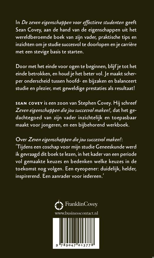 In 'De zeven eigenschappen voor effectieve studenten' geeft Sean Covey, aan de hand van de eigenschappen uit het wereldberoemde boek van zijn vader, praktische tips en inzichten om je studie succesvol te doorlopen en je carrière met een stevige basis te starten.
