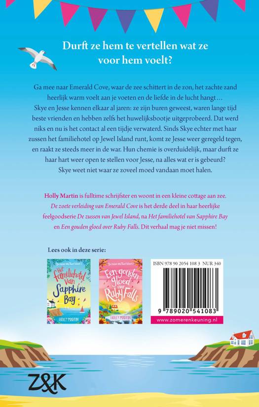 Skye en Jesse in 'De zoete verleiding van Emerald Cove' van Holly Martin kennen elkaar al jaren: ze zijn buren geweest, beste vrienden en ze waren zelfs kort getrouwd. Het contact is al een tijdje verwaterd, maar nu Skye met haar zussen het familiehotel op Jewel Island runt, komt ze Jesse weer tegen. Skye wil hem eindelijk vertellen wat ze voor hem voelt, maar durft ze haar hart weer open te stellen voor Jesse? 'De zoete verleiding van Emerald Cove' is het derde deel van de heerlijke feelgood-serie De zussen van Jewel Island. Eerder verschenen in de serie 'Het familiehotel van Sapphire Bay' en 'Een gouden gloed over Ruby Falls'.