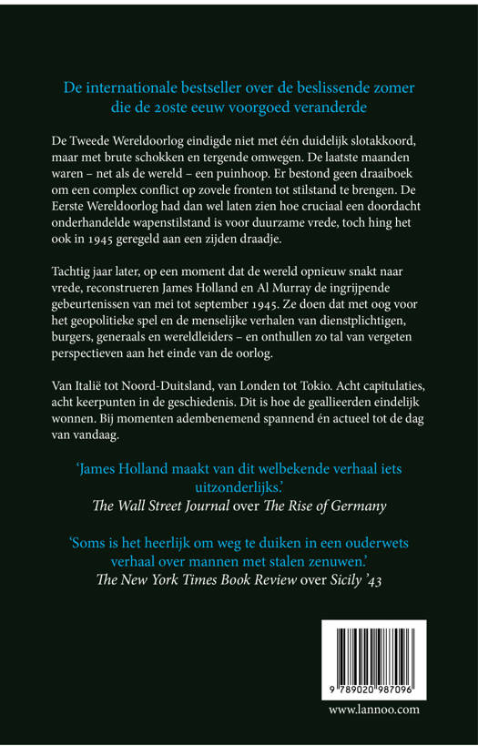 De Tweede Wereldoorlog eindigde niet met één duidelijk slotakkoord, maar met brute schokken en tergende omwegen. De laatste maanden waren - net als de wereld - een puinhoop. Er bestond geen draaiboek om een complex conflict op zovele fronten tot stilstand te brengen. De Eerste Wereldoorlog had dan wel laten zien hoe cruciaal een doordacht onderhandelde wapenstilstand is voor duurzame vrede, toch hing het ook in 1945 geregeld aan een zijden draadje. Tachtig jaar later, op een moment dat de wereld opnieuw snakt naar vrede, reconstrueren James Holland en Al Murray de ingrijpende gebeurtenissen van mei tot september 1945. Ze doen dat met oog voor het geopolitieke spel en de menselijke verhalen van dienstplichtigen, burgers, generaals en wereldleiders – en onthullen zo tal van vergeten perspectieven aan het einde van de oorlog. Van Italië tot Noord-Duitsland, van Londen tot Tokio. Acht capitulaties, acht keerpunten in de geschiedenis. Dit is hoe de geallieerden eindelijk wonnen. Bij momenten adembenemend spannend én actueel tot de dag van vandaag.