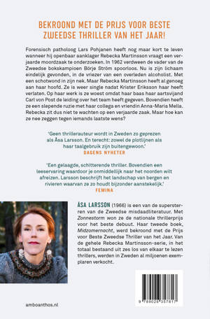 Geen thrillerauteur wordt in Zweden zo geprezen als Åsa Larsson. En terecht: zowel de plotlijnen als haar taalgebruik zijn buitengewoon. Dagens Nyheter Een gelaagde, schitterende thriller. Bovendien een leeservaring waardoor je onmiddellijk naar het noorden wilt afreizen. Larsson beschrijft het landschap van bergen en rivieren waarvan ze zo houdt bijzonder aanstekelijk. Femina