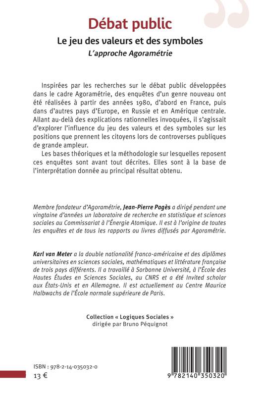 Inspirées par les recherches sur le débat public développées dans le cadre Agoramétrie, des enquêtes d'un genre nouveau ont été réalisées à partir des années 1980, d'abord en France, puis dans d'autres pays d'Europe, en Russie et en Amérique centrale. Allant au-delà des explications rationnelles invoquées par les citoyens, il s'agissait d'explorer l'influence du jeu des valeurs et des symboles sur les positions qu'ils prennent lors de controverses publiques de grande ampleur. Les bases théoriques et la méthodologie sur lesquelles reposent ces enquêtes sont avant tout décrites. Elles sont à la base de l'interprétation donnée au principal résultat obtenu.