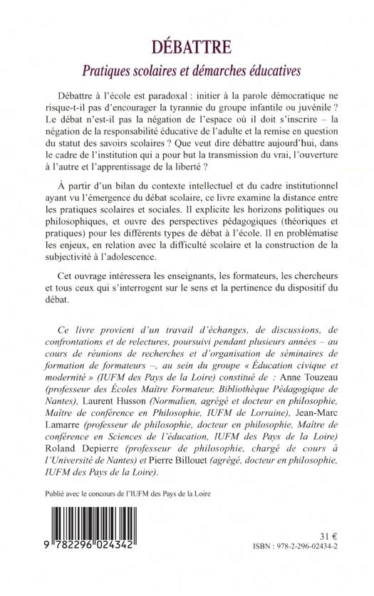 Que veut dire débattre dans le cadre d'une institution qui a pour but la transmission du vrai, l'ouverture à l'autre et l'apprentissage de la liberté ? Ce livre examine la distance entre les pratiques scolaires et sociales et s'interroge sur le sens et la pertinence du dispositif de débat.