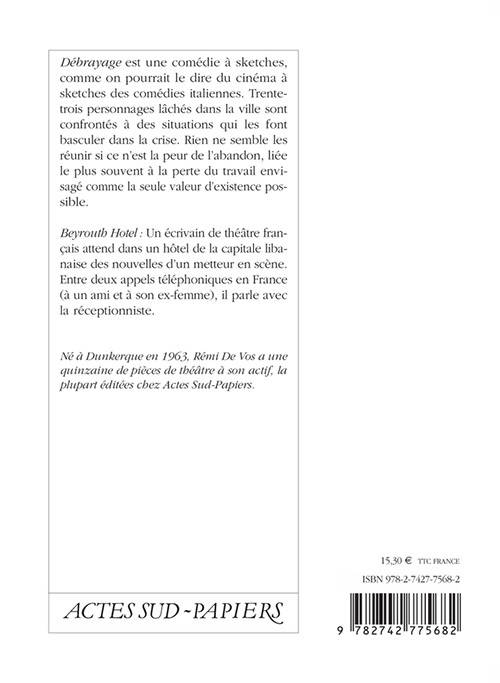 « Né à Dunkerque en 1963, Rémi De Vos a une quinzaine de pièces de théâtre à son actif, la plupart éditées chez Actes Sud-Papiers. »