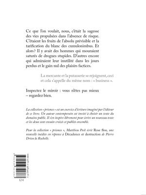Rose flou est une nouvelle inédite de Matthieu Peck, écrite en réponse à "Décadence et destruction" de Pierre Drieu la Rochelle (1927). Avec la plume acérée qui le caractérise, il y raconte l'histoire de Louis Ditchka, un start-upper bourgeois qui fait la rencontre d'un clochard venu s'abriter dans son hall d'immeuble. Le récit progresse dans une violence sociale inouïe que la puissance des descriptions rend tristement banale. L'auteur interroge le lecteur sur ce qui l'entoure dans nos sociétés développées et sur la vacuité dont l'homme peut faire preuve en 2021.