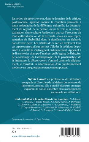 La notion de décentrement, qui organise la logique de ce recueil, permet, à travers la multiplicité des champs disciplinaires, de repenser les grandes questions littéraires, philosophiques, anthropologiques, en s'efforçant chaque fois d'effectuer un léger déplacement, particulièrement fécond en ce qu'il oblige à poser, penser autrement le regard sur les cultures contemporaines.