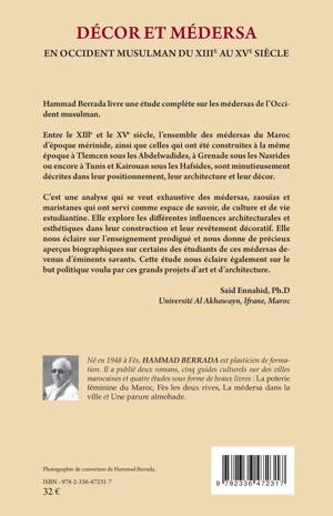 Hammad Berrada livre une étude complète sur les médersas de l'Occident musulman. Entre le XIlle et le XVe siècle, l'ensemble des médersas du Maroc d'époque mérinide, ainsi que celles qui ont été construites à la même époque à Tlemcen sous les Abdelwadides, à Grenade sous les Nasrides ou encore à Tunis et Kairouan sous les Hafsides, sont minutieusement décrites dans leur positionnement, leur architecture et leur décor. C'est une analyse qui se veut exhaustive des médersas, zaouïas et maristanes qui ont servi comme espace de savoir, de culture et de vie estudiantine. Elle explore les différentes influences architecturales et esthétiques dans leur construction et leur revêtement décoratif. Elle nous éclaire sur l'enseignement prodigué et nous donne de précieux aperçus biographiques sur certains des étudiants de ces médersas devenus d'éminents savants. Cette étude nous éclaire également sur le but politique voulu par ces grands projets d'art et d'architecture. Said Ennahid, Ph.D , Université Al Akhawayn, Ifrane, Maroc