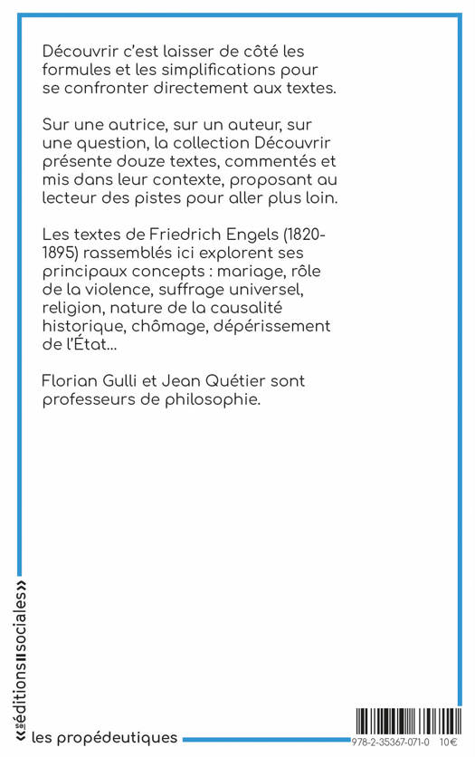 L'objet de ce livre n'est pas d'opposer Friedrich Engels à Karl Marx mais de faire apparaître la singularité du premier, son autonomie en quelque sorte. Et de l'extraire un moment de ce « Marx-Engels » infligé aux deux amis par une postérité qui leur a certes fait pire. Les douze textes ici rassemblés abordent, entre autres, la question du mariage, le rôle de la violence, le suffrage universel, la religion, la nature de la causalité historique, l'origine du chômage ou le dépérissement de l'État... Ils révèlent ainsi un homme profondément de son temps et engagé non seulement dans les révolutions sociales et politiques mais aussi dans les débats philosophiques, curieux des bouleversements scientifiques et culturels de son époque, ouvert à un monde déjà mondialisé. Chaque texte, à la manière de la collection, est présenté, mis dans son contexte et commenté, proposant au lecteur des pistes pour aller plus loin.