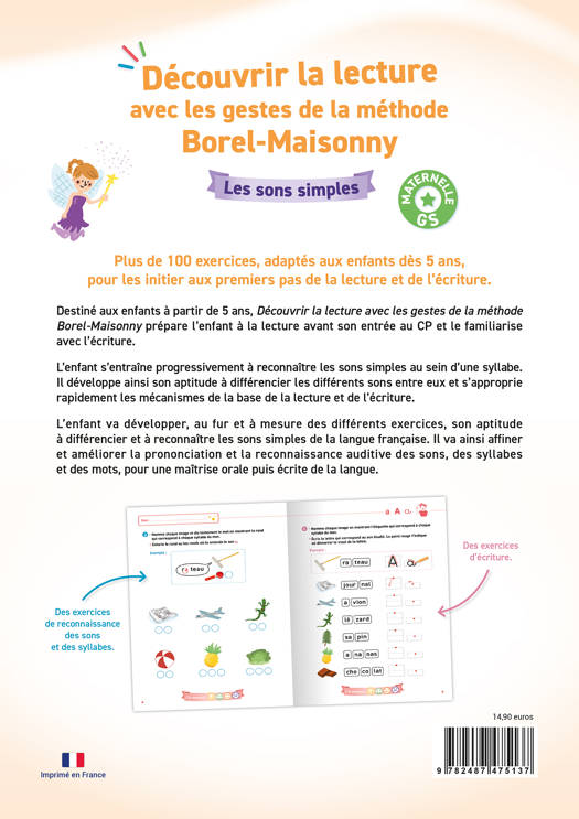 Destiné aux enfants à partir de 5 ans, Découvrir la lecture avec les gestes de la Méthode Borel-Maisonny prépare l’enfant à la lecture avant son entrée au CP et le familiarise avec l’écriture.
