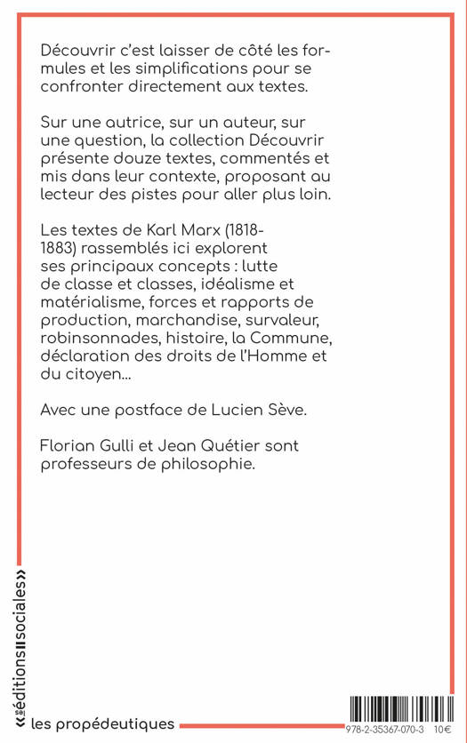 Est-il encore besoin de découvrir Marx ? Comme souvent, ce qui semble su comme une sorte d'évidence est en réalité mal connu. Ce qui s'applique particulièrement à Marx tant le rapport à son oeuvre fut l'occasion de grandes passions, de belles actions et de méfaits terribles. Marx n'en finit pas d'interpeller ceux qui s'essaient à penser nos sociétés et leurs mouvements, les actions humaines et leurs effets. Découvrir Marx, c'est laisser de côté les formules et les simplifications pour se confronter directement aux écrits de l'auteur. Cet ouvrage, accessible à tous, présente, explique et commente douze textes de Karl Marx, douze textes utiles à la compréhension du monde moderne dont il fut l'un des grands annonciateurs et des plus subtils critiques.