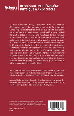 Le rôle d’Édouard Branly (1844-1940) dans les premiers développements de la transmission par radio fut important. Certes, l’expérience fondatrice (1888) est due à Hertz, mais Branly mit au point en 1890 un détecteur bien plus efficace que celui de Hertz, et ce détecteur (une poudre métallique dont on mesurait la résistance) permit à Marconi de transmettre des messages radio à des distances de plus en plus grandes, jusqu’à traverser la Manche en 1899. Ce livre raconte et commente la genèse de la découverte de Branly. Il est illustré par des dizaines de pages extraites de carnets de laboratoire où le savant notait ses résultats, mais aussi ses hésitations et ses doutes. Ces extraits représentant un peu plus du tiers de ce livre, permettent au lecteur d’admirer l’ingéniosité des chercheurs qui, il y a un peu plus d’un siècle, avec une technologie rudimentaire, surent mettre en évidence les ondes électromagnétiques, celles-là même qui actionnent nos téléphones portables et nos téléviseurs.