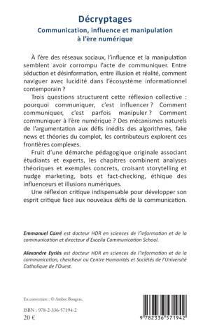 À l'ère des réseaux sociaux, l'influence et la manipulation semblent avoir corrompu l'acte de communiquer. Entre séduction et désinformation, entre illusion et réalité, comment naviguer avec lucidité dans l'écosystème informationnel contemporain ? Trois questions structurent cette réflexion collective pourquoi communiquer, c'est influencer ? Comment communiquer, c'est parfois manipuler ? Comment communiquer à l'ère numérique ? Des mécanismes naturels de l'argumentation aux défis inédits des algorithmes, fake news et théories du complot, les contributeurs explorent ces frontières complexes. Fruit d'une démarche pédagogique originale associant étudiants et experts, les chapitres combinent analyses théoriques et exemples concrets, croisant storytelling et nudge marketing, bots et fact-checking, éthique des influenceurs et illusions numériques. Une réflexion critique indispensable pour développer son esprit critique face aux nouveaux défis de la communication.