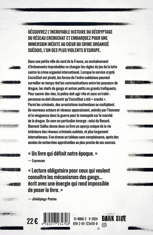 Dans une petite ville du nord de la France, un enchaînement d’événements improbables va changer les règles du jeu de la lutte contre le crime organisé international. Lorsque le service crypté EncroChat est piraté, les forces de l’ordre suédoises peuvent surveiller en temps réel les communications entre les passeurs de drogue, les chefs de gangs et autres petits ou grands trafiquants. Pour sauver des vies, la police doit agir vite et sans se trahir: personne ne doit découvrir qu’EncroChat a été « cracké ». Parmi les criminels, des arrestations inattendues se multiplient. De  nouveaux acteurs et réseaux apparaissent, animés par l’honneur et  la  vengeance dans la guerre pour le monopole sur le marché de  la  drogue. Un nom en particulier émerge : celui du Renard. Diamant Salihu donne dans ce livre un aperçu unique de la vie intérieure des réseaux criminels suédois, et plus largement internationaux. Il en dresse un tableau sans complaisance, après des années de recherches approfondies au plus proche de ses sources.