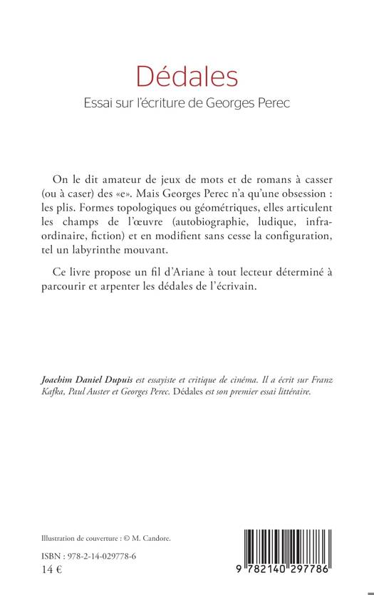 On le dit amateur de jeux de mots et de romans à casser (ou à caser) des «e». Mais Georges Perec n'a qu'une obsession : les plis. Formes topologiques ou géométriques, elles articulent les champs de l'oeuvre (autobiographie, ludique, infra- ordinaire, fiction) et en modifient sans cesse la configuration, tel un labyrinthe mouvant. Ce livre propose un fil d'Ariane à tout lecteur déterminé à parcourir et arpenter les dédales de l'écrivain.