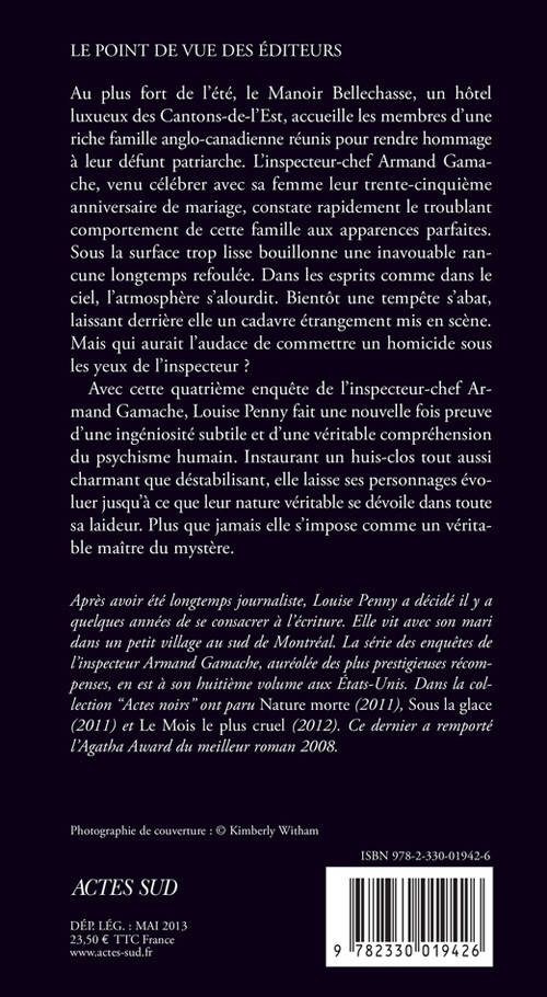 Avec cette quatrième enquête de l'inspecteur-chef Armand Gamache, Louise Penny fait une nouvelle fois preuve d'une ingéniosité subtile et d'une véritable compréhension du psychisme humain. Instaurant un huis-clos tout aussi charmant que déstabilisant, elle laisse ses personnages évoluer jusqu'à ce que leur nature véritable se dévoile dans toute sa laideur. Plus que jamais elle s'impose comme un véritable maître du mystère.