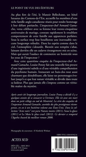 Au plus fort de l'été, le Manoir Bellechasse, un hôtel luxueux des Cantons-de-l'Est, accueille les membres d'une riche famille anglo-canadienne réunis pour rendre hommage à leur défunt patriarche. L'inspecteur-chef Armand Gamache, venu célébrer avec sa femme leur trente-cinquième anniversaire de mariage, constate rapidement le troublant comportement de cette famille aux apparences parfaites. Sous la surface trop lisse bouillonne une inavouable rancune longtemps refoulée. Dans les esprits comme dans le ciel, l'atmosphère s'alourdit. Bientôt une tempête s'abat, laissant derrière elle un cadavre étrangement mis en scène. Mais qui aurait l'audace de commettre un homicide sous les yeux de l'inspecteur ?