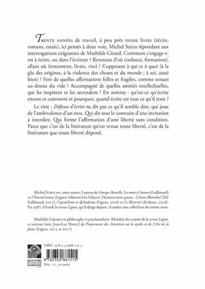 Trente annees de travail, a peu pres trente livres (recits, romans, essais), ici penses a deux voix, Michel Surya repondant aux interrogations exigeantes de Mathilde Girard. Comment s'engage-t-on a ecrire, ou dans l'ecriture ? Revenant d'ou (enfance, formation), allant ou (rencontres, livres, vies) ? S'opposant a qui et a quoi (a la glu des origines, a la violence des choses et du monde; a soi, aussi bien) ? Fort de quelles affirmations folles et fragiles, comme tenues au-dessus du vide ? Accompagne de quelles amities intellectuelles, qui les inspirent et les secondent ? En somme: qu'est-ce qu'ecrire encore et comment et pourquoi, quand ecrire est tout ce qu'il reste ? Le titre: Defense d'ecrire ne dit pas ce qu'il semble dire, qui joue de l'ambivalence d'un mot. Qui dit tout le contraire d'une invitation a interdire. Qui forme l'affirmation d'une liberte sans condition. Parce que c'est de la litterature qu'est venue toute liberte, c'est de la litterature que toute liberte depend.