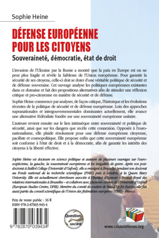 L'invasion de l'Ukraine par la Russie a montré que la paix en Europe est on ne peut plus fragile et révèle la faiblesse de l'Union européenne. Pour garantir la sécurité de ses citoyens, celle-ci doit se doter d'une véritable politique de sécurité et de défense souveraine. Cet ouvrage analyse les politiques européennes existantes dans ce domaine et fait des propositions alternatives afin de stimuler une réflexion critique et pro-citoyenne en matière de sécurité et de défense.