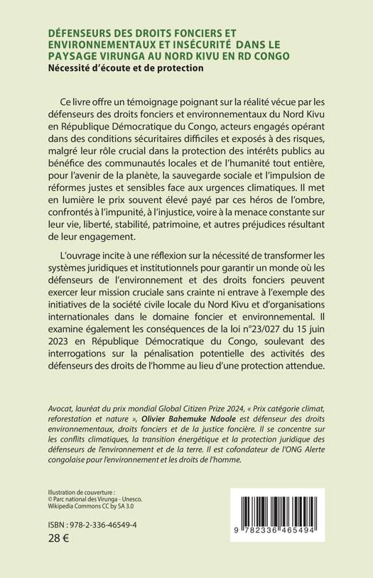 Ce livre offre un témoignage poignant sur la réalité vécue par les défenseurs des droits fonciers et environnementaux du Nord Kivu en République Démocratique du Congo, acteurs engagés opérant dans des conditions sécuritaires difficiles et exposés à des risques, malgré leur rôle crucial dans la protection des intérêts publics au bénéfice des communautés locales et de l'humanité tout entière, pour l'avenir de la planète, la sauvegarde sociale et l'impulsion de réformes justes et sensibles face aux urgences climatiques. Il met en lumière le prix souvent élevé payé par ces héros de l'ombre, confrontés à l'impunité, à l'injustice, voire à la menace constante sur leur vie, liberté, stabilité, patrimoine, et autres préjudices résultant de leur engagement. L’ouvrage incite à une réflexion sur la nécessité de transformer les systèmes juridiques et institutionnels pour garantir un monde où les défenseurs de l'environnement et des droits fonciers peuvent exercer leur mission cruciale sans crainte ni entrave à l’exemple des initiatives de la société civile locale du Nord Kivu et d’organisations internationales dans le domaine foncier et environnemental. Il examine également les conséquences de la loi n°23/027 du 15 juin 2023 en République démocratique du Congo, soulevant des interrogations sur la pénalisation potentielle des activités des défenseurs des droits de l'homme au lieu d'une protection attendue.