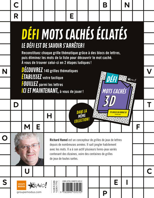 Reconstituez chaque grille thématique grâce à des blocs de lettres, puis éliminez les mots de la liste pour finalement découvrir le mot caché. À vous de retrouver celui-ci en 2 étapes ludiques !