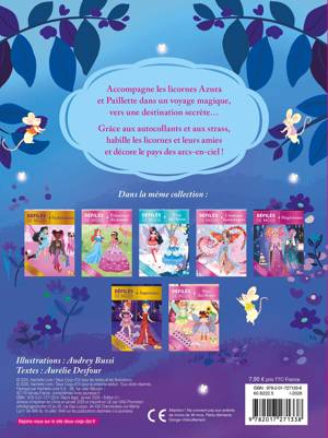 Accompagne les licornes Azura et Paillette dans un voyage magique, vers une destination secrète... Grâce aux autocollants et aux strass, habille les licornes et leurs amies et décore le pays des arcs-en-ciel !
