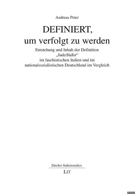 Die vorliegende Arbeit zeigt den Entstehungsprozess und den rechtlichen Inhalt der Definition "Jude/Jüdin" im faschistischen Italien und nationalsozialistischen Deutschland auf. Diese Definitionen bildeten die Grundlage für die Verfolgung oder Nichtverfolgung, auch von "Mischlingen" und Kindern aus gemischten Ehen. Anhand von Einzelschicksalen wird der Verfolgungsmechanismus aufgezeigt. Von Bedeutung ist zudem, dass die Verfolgung der italienischen Juden ab dem Jahr 1938 ohne irgendwelchen Einfluss Deutschlands ihren Anfang nahm.Andreas Peter, geboren 1956 in Zürich, Historiker und Jurist. Jahrzehntelange Berufstätigkeit in verschiedenen staatlichen Institutionen.