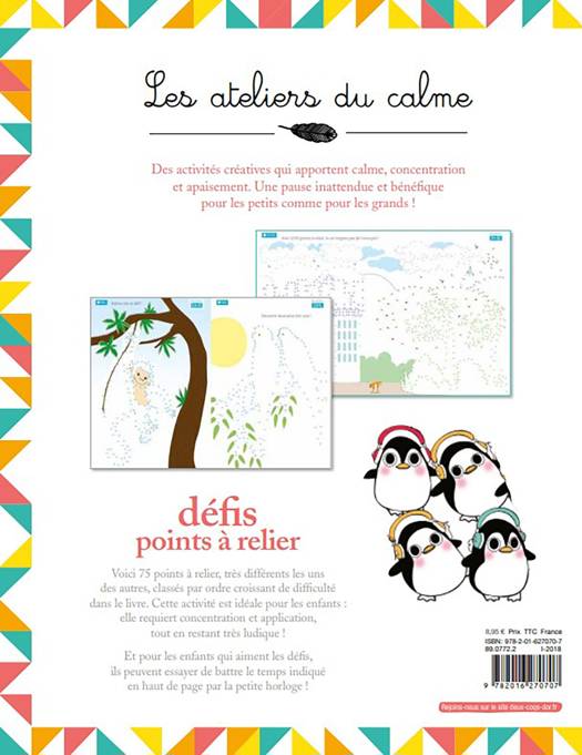 75 dessins sur des sujets divers (sport, animaux, vie quotidienne…) en points à relier à réaliser et à découvrir. Un temps indiqué est à respecter, pour jouer dans le calme et développer sa concentration.