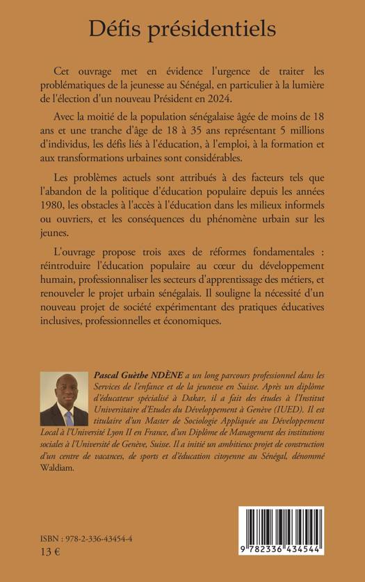 Cet ouvrage met en évidence l'urgence de traiter les problématiques de la jeunesse au Sénégal, en particulier à la lumière de l'élection d'un nouveau Président en 2024. Avec la moitié de la population sénégalaise âgée de moins de 18 ans et une tranche d'âge de 18 à 35 ans représentant 5 millions d'individus, les défis liés à l'éducation, à l'emploi, à la formation et aux transformations urbaines sont considérables. Les problèmes actuels sont attribués à des facteurs tels que l'abandon de la politique d'éducation populaire depuis les années 1980, les obstacles à l'accès à l'éducation dans les milieux informels ou ouvriers, et les conséquences du phénomène urbain sur les jeunes. L'ouvrage propose trois axes de réformes fondamentales: réintroduire l'éducation populaire au coeur du développement humain, professionnaliser les secteurs d'apprentissage des métiers, et renouveler le projet urbain sénégalais. Il souligne la nécessité d'un nouveau projet de société expérimentant des pratiques éducatives inclusives, professionnelles et économiques.