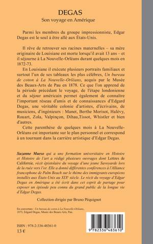 Parmi les membres du groupe impressionniste, Edgar Degas est le seul à être allé aux États-Unis. Il rêve de retrouver ses racines maternelles - sa mère originaire de Louisiane est morte lorsqu'il avait 13 ans - et il séjourne à La Nouvelle-Orléans durant quelques mois en 1872-73. En Louisiane il exécute plusieurs portraits familiaux et surtout l'un de ses tableaux les plus célèbres, Un bureau de coton à La Nouvelle-Orléans, acquis par le Musée des Beaux-Arts de Pau en 1878. Ce que l'on apprend de la période précédant le voyage, de l'étape londonienne et du séjour américain permet également de connaître l'important réseau d'amis et de connaissances d'Edgard Degas, une véritable colonie d'artistes, d'écrivains, de musiciens, d'ingénieurs Manet, Berthe Morisot, Halévy, Rouart, Zola, Valpinçon, Dihau, Tissot, Whistler et bien d'autres. Cette parenthèse de quelques mois à La Nouvelle-Orléans est importante sur le plan personnel et correspond à un tournant dans la carrière artistique d'Edgar Degas.