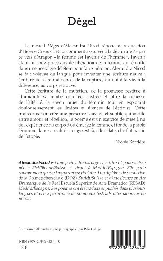 Le recueil Dégel d’Alexandra Nicod répond à la question d’Hélène Cixous « et toi comment as-tu vécu la déchirure ? » par ce vers d’Aragon « la femme est l’avenir de l’homme », l’avenir étant un long processus de libération de la femme qui étouffe dans une nostalgie délétère pour faire création. Alexanda Nicod se fait voleuse de langue pour inventer une écriture neuve  : écriture de la re-naissance, de la rupture, du oui à la vie, à la différence, au corps retrouvé.