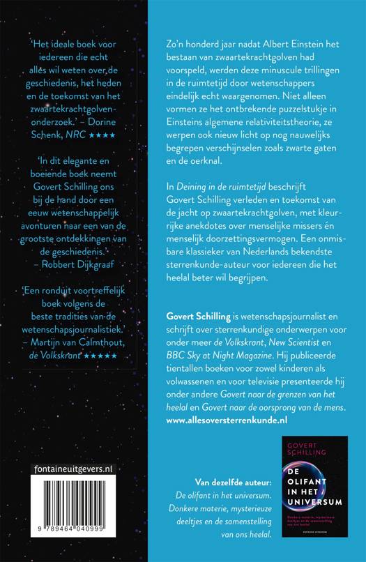 In Deining in de ruimtetijd beschrijft Govert Schilling verleden en toekomst van de jacht op zwaartekrachtgolven, met kleurrijke anekdotes over menselijke missers én menselijk doorzettingsvermogen. Het boek verscheen vlak nadat de intrigerende rimpelingen in de ruimtetijd voor het eerst werden waargenomen, en onomstotelijk werd bewezen dat Einstein gelijk had, en groeide uit tot een standaardwerk over zwaartekrachtgolven dat nog steeds uiterst actueel is.