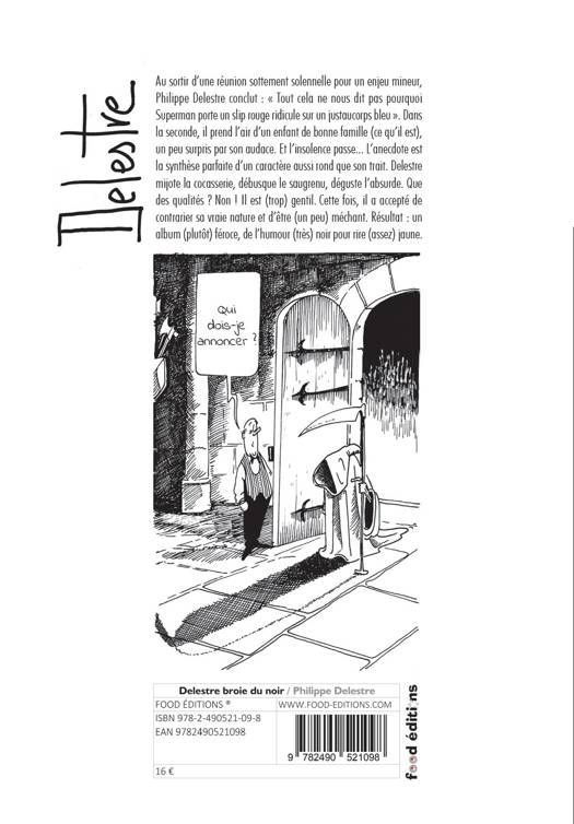 Au sortir d’une réunion sottement solennelle pour un enjeu mineur, Philippe Delestre conclut : « Tout cela ne nous dit pas pourquoi Superman porte un slip rouge ridicule sur un justaucorps bleu ». Dans la seconde, il prend l’air d’un enfant de bonne famille (ce qu’il est), un peu surpris par son audace. Et l’insolence passe... L’anecdote est la synthèse parfaite d’un caractère aussi rond que son trait. Delestre mijote la cocasserie, débusque le saugrenu, déguste l’absurde. N'aurait-il que des qualités ? Non ! Il est (trop) gentil. Cette fois, il a accepté de contrarier sa vraie nature et d’être (un peu) méchant. Résultat : un album (plutôt) féroce, de l’humour (très) noir pour rire (assez) jaune.