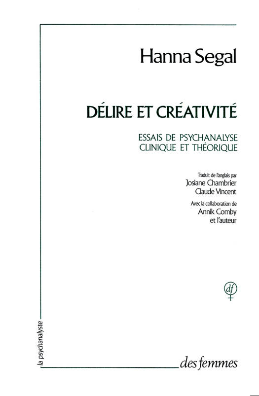 « Ce livre rassemble des articles qu'Hanna Segal écrivit de 1947 à 1980. Le premier, « Approche psychanalytique de l'esthétique », porte le germe de sa pensée ultérieure et de sa recherche originale dans tout ce qui touche au symbolisme, au sein du développement psychique. « Délire et créativité », écrit plus tardif (1974), donne son titre à l'édition française de ce livre. Hanna Segal apporta, dès le début, une part considérable au travail exceptionnellement créatif qui fut produit par le groupe des analystes travaillant dans le champ kleinien, qui prenait naissance en contact étroit avec Melanie Klein, au sein de la Société Britannique de Psychanalyse, dans les années 1950. Son souci de transmettre et de développer ce que Melanie Klein avait donné de plus fécond à la psychanalyse apparaît sans cesse et en particulier dans la très grande rigueur qui soutient toujours son travail clinique et ses élaborations théoriques. » A.C.