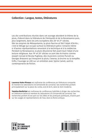 Les dix contributions réunies dans cet ouvrage abordent le thème de la pluie, d'abord dans la littérature de l'Antiquité et de la Renaissance puis, plus largement, dans les arts européens des 20e et 21e siècles. Dès les empires de Mésopotamie, la pluie fascine et fait l'objet d'écrits ; c'est le Déluge qui occupe surtout la littérature gréco-romaine même si d'autres représentations renvoient à la technique et à la médecine. Pendant la Renaissance, la pluie diluvienne fait avant tout l'objet d'une lecture religieuse. Aux 19e et 20e siècle ce sont des écrivains comme Joseph Conrad et Nicola Pugliese, des musiciens comme Purcell ou Georges Brassens qui évoquent la pluie, l'averse, la bruine ou la tempête. Enfin, l'ouvrage se clôt sur un entretien avec Sylvie Camet, autrice contemporaine de fiction.