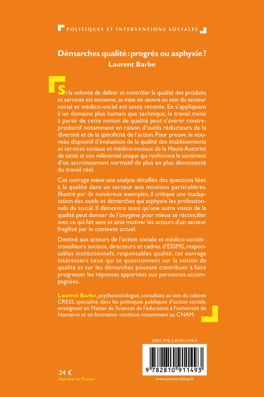 Si la volonté de définir et contrôler la qualité des produits et services est ancienne, sa mise en oeuvre au sein du secteur social et médico-social est assez récente. En s’appliquant à un domaine plus humain que technique, le travail mené à partir de cette notion de qualité peut s’avérer contre- productif notamment en raison d’outils réducteurs de la diversité et de la spécificité de l’action. Pour preuve, le nouveau dispositif d’évaluation de la qualité des établissements et services sociaux et médico-sociaux de la Haute Autorité de santé et son référentiel unique qui renforcent le sentiment d’un accroissement normatif de plus en plus déconnecté du travail réel. Cet ouvrage mène une analyse détaillée des questions liées à la qualité dans un secteur aux missions particulières. Illustré par de nombreux exemples, il critique une inadaptation des outils et démarches qui asphyxie les professionnels du social. Il démontre aussi qu’une autre vision de la qualité peut donner de l’oxygène pour mieux se réconcilier avec ce qui fait sens et ainsi motiver les acteurs d’un secteur fragilisé par le contexte actuel. Destiné aux acteurs de l’action sociale et médico-sociale : travailleurs sociaux, directeurs et cadres d’ESSMS, responsables institutionnels, responsables qualité, cet ouvrage intéressera ceux qui se questionnent sur la notion de qualité et sur les démarches pouvant contribuer à faire progresser les réponses apportées aux personnes accompagnées.