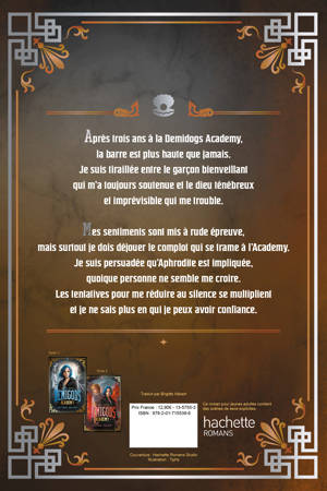 Grâce à l’intervention d’Hadès, Lucian est revenu à la vie. Melany, tiraillée entre le jeune homme qu’elle croyait perdu à jamais et le dieu des ténèbres aux nombreux secrets, voit ses émotions mises à rude épreuve. Mais avant qu’elle n’ait le temps de mettre au clair ses sentiments, une nouvelle menace apparaît : les anciens Titans se déchaînent, provoquant des catastrophes sans précédent dans le monde entier. L’armée des Dieux va enfin pouvoir prouver sa valeur, et Melany devra décider à quel camp elle appartient. Une guerre est sur le point d’éclater. A seulement vingt ans, elle est la seule à pouvoir l’arrêter. Mais comment choisir entre l’ombre et la lumière ?