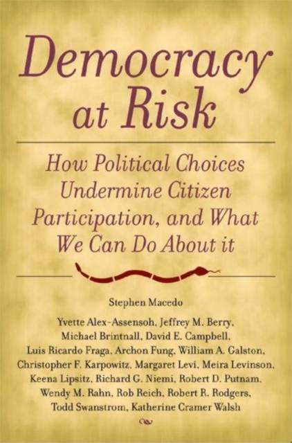 Voter turnout was unusually high in the 2004 U.S. presidential election. At first glance, that level of participation--largely spurred by war in Iraq and a burgeoning culture war at home--might look like vindication of democracy. If the recent past is any indication, however, too many Americans will soon return to apathy and inactivity. Clearly, all is not well in our civic life. Citizens are participating in public affairs too infrequently, too unequally, and in too few venues to develop and sustain a robust democracy. This important new book explores the problem of America's decreasing involvement in its own affairs. D emocracy at Risk reveals the dangers of civic disengagement for the future of representative democracy. The authors, all eminent scholars, undertake three main tasks: documenting recent trends in civic engagement, exploring the influence that the design of political institutions and public policies have had on those trends, and recommending steps that will increase the amount and quality of civic engagement in America. The authors focus their attention on three key areas: the electoral process, including elections and the way people get involved; the impact of location, including demographic shifts and changing development patterns; and the critical role of nonprofit organizations and voluntary associations, including the philanthropy that help keep them going.
