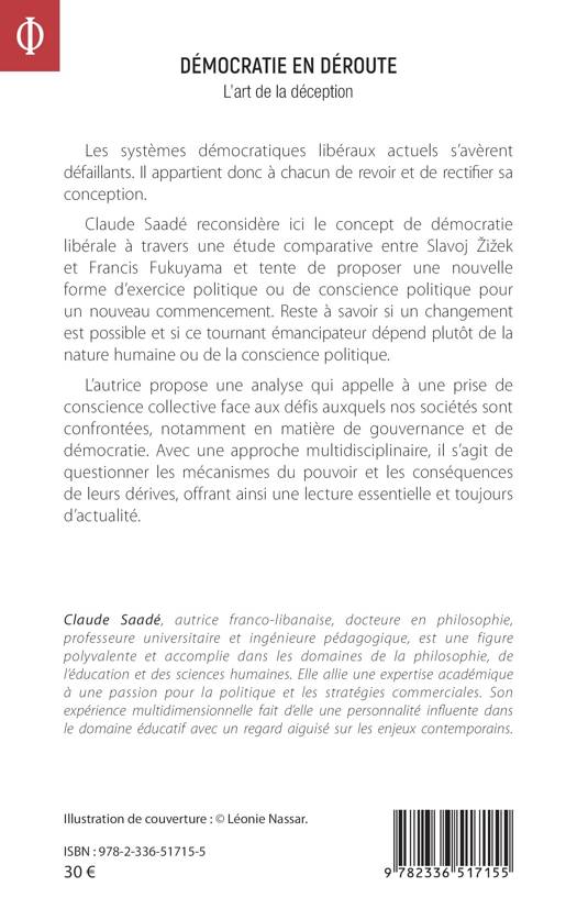 Les systèmes démocratiques libéraux actuels s'avèrent défaillants. Il appartient donc à chacun de revoir et de rectifier sa conception. Claude Saadé reconsidère ici le concept de démocratie libérale à travers une étude comparative entre Slavoj Zizek et Francis Fukuyama et tente de proposer une nouvelle forme d'exercice politique ou de conscience politique pour un nouveau commencement. Reste à savoir si un changement est possible et si ce tournant émancipateur dépend plutôt de la nature humaine ou de la conscience politique. L'autrice propose une analyse qui appelle à une prise de conscience collective face aux défis auxquels nos sociétés sont confrontées, notamment en matière de gouvernance et de démocratie. Avec une approche multidisciplinaire, il s'agit de questionner les mécanismes du pouvoir et les conséquences de leurs dérives, offrant ainsi une lecture essentielle et toujours d'actualité.