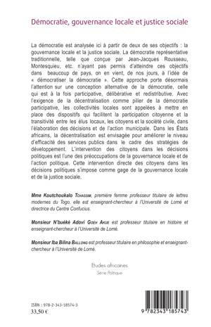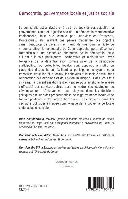 La démocratie est analysée ici à partir de deux de ses objectifs : la gouvernance locale et la justice sociale. La démocratie représentative traditionnelle n'ayant pas permis d'atteindre ces objectifs dans beaucoup de pays, on en vient, de nos jours, à l'idée de « démocratiser la démocratie ». Cette approche porte désormais l'attention sur une conception alternative de la démocratie, celle qui est à la fois participative, délibérative et redistributive. Dans les États africains, la décentralisation est envisagée et l'intervention des citoyens dans les décisions politiques est l'une des préoccupations de la gouvernance locale et de l'action politique. Cette intervention directe des citoyens dans les décisions politiques s'impose comme gage de la gouvernance locale et de la justice sociale.