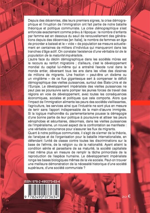 Depuis des décennies, dès leurs premiers signes, la crise démographique et l’irruption de l’immigration ont fait partie de notre bataille théorique et politique communiste. La crise démographique s’est enfoncée exactement comme prévu à l’époque : le nombre d’enfants par femme est en dessous du seuil de renouvellement des générations depuis des décennies [en Italie], le nombre de femmes en âge de procréer a baissé et le « vide » de population se mesure actuellement en centaines de milliers d’individus qui manqueront dans les tranches d’âge actif. On constate l’existence d’une véritable loi de la population de la maturité impérialiste. L’autre face du déclin démographique dans les sociétés mûres est le recours au renfort migratoire ; d’ailleurs, c’est le développement mondial du capital lui-même qui a entraîné l’exode rural dans le monde entier, déversant tous les ans dans les villes des dizaines de millions de migrants. Une fraction – peut-être un dixième ou un vingtième – de ce flux gigantesque sert à compenser le déficit démographique des vieilles puissances, surtout des États-Unis et de l’Europe. Le développement impérialiste des vieilles puissances ne peut pas se poursuivre sans pomper les jeunes forces de travail des régions en voie de développement, avec toutes les conséquences économiques, sociales et politiques que cela comporte. Alors que l’impact de l’immigration alimente les peurs des sociétés vieillissantes, l’agriculture, les services ainsi que l’industrie ne sont plus en mesure de tenir sans l’apport indispensable de la main-d’œuvre immigrée. Si la logique malhonnête du parlementarisme pousse la démagogie d’une bonne partie de leur politique à poursuivre et attiser les peurs xénophobes et sécuritaires, désormais, dans les vieilles puissances de l’impérialisme, un nouvel aspect de la confrontation se manifeste : une véritable concurrence pour s’assurer les flux de migrants. Quant à notre politique communiste, il s’agit de s’armer de la théorie, de l’analyse et de l’organisation pour la bataille internationaliste, en défendant l’unité de classe contre toutes les discriminations sur la base de l’ethnie, de la religion ou de la nationalité. Ayant atteint la condition sénile et parasitaire de sa maturité, la société capitaliste n’est même plus en mesure de remplir la tâche primordiale de la reproduction de l’espèce humaine. Le développement impérialiste ronge les bases biologiques mêmes de la vie sociale. Peut-on trouver une meilleure démonstration de la nécessité historique d’une société supérieure, d’une société communiste ?