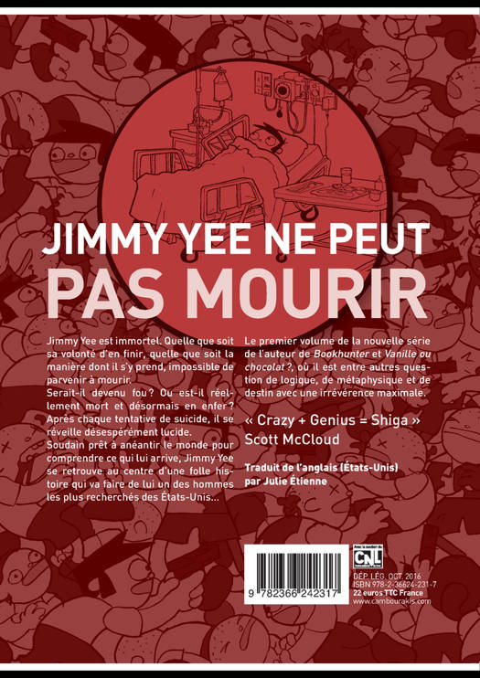 Après le succès de «Bookhunter» (3500 ex) et «Vanille ou chocolat ?» (5000 ex) voici le premier volume (sur 4) du nouveau projet-fleuve du prodige américain de la BD. Mathématicien et père de famille banal, Jimmy Lee n'a jamais rien entrepris d'original dans sa vie avant de réserver une chambre dans un motel afin de s'y suicider. Il échoue, multiplie les tentatives, toujours sans succès... Ressort humoristique grinçant de la narration, cette répétition devient le moteur d'une folle histoire qui va faire de Jimmy et de ses réincarnations à différents moments de sa vie un des hommes les plus recherchés du pays. Où il est question de logique, de métaphysique, de destin et de religion...