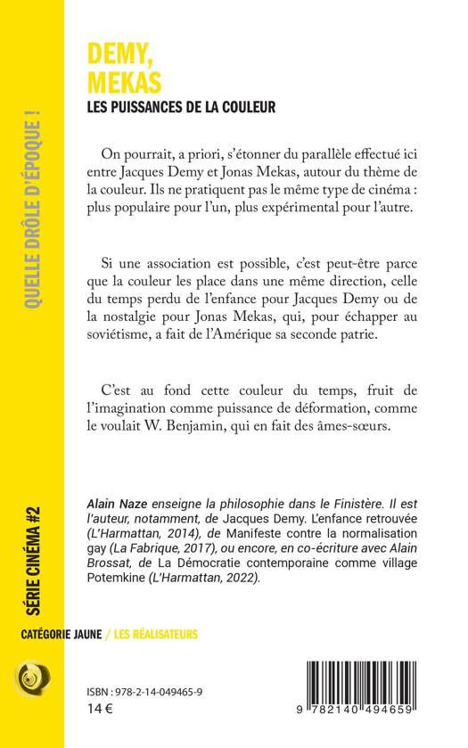 On pourrait, à priori, s'étonner du parallèle effectué ici entre Jacques Demy et Jonas Mekas, autour du thème de la couleur. Ils ne pratiquent pas le même type de cinéma : plus populaire pour l'un, plus expérimental pour l'autre. Si une association est possible, c est peut-être parce que la couleur les place dans une même direction, celle du temps perdu de l'enfance pour Jacques Demy ou de la nostalgie pour Jonas Mekas, qui, pour échapper au soviétisme, a fait de l'Amérique sa seconde patrie. C'est au fond cette couleur du temps, fruit de l imagination comme puissance de déformation, comme le voulait W. Benjamin, qui en fait des âmes-surs.