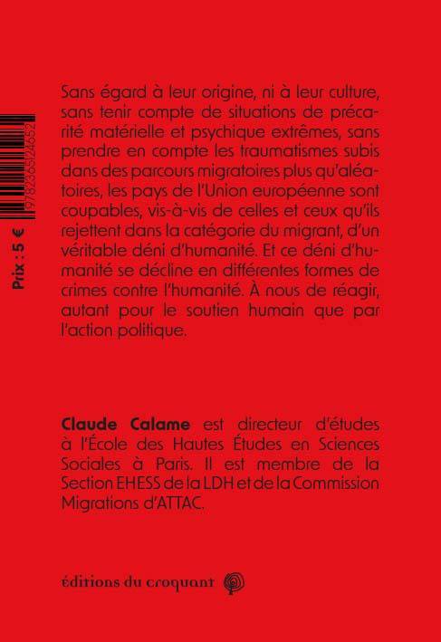 Les Éditions du Croquant, qui s’inscrivent dans une démarche critique des phénomènes de domination, proposeront dès septembre, une nouvelle collection. Constituée de textes relativement brefs (autour de 60 000 signes), incisifs, dans le genre « coups de poing » ou « coups de gueule ». Le titre de la collection en donne l’esprit et le ton : Halte là ! Trop c’est trop ! Stop ! Carton rouge ! Il s’agit de faire part de nos indignations, de nos colères. Non pas de façon négative, mais en privilégiant l’expression argumentée d’une prise de conscience de l’intolérable. Nous solliciterons les autrices et auteurs du Croquant. Mais aussi de nouveaux témoins et/ou analystes des phénomènes sociaux. À charge pour eux de dire de façon ramassée l’objet de leurs révoltes, de dénoncer les phénomènes, procédures, décisions politiques et sociales qui portent atteinte à la dignité humaine, à la justice. Certains feront connaître de façon adaptée au format de la collection les résultats de leurs recherches, d'autres choisiront de partager des expériences collectives ou sensibles, à la fois emblématiques d’une époque et riches de leur singularité. Sortons les Cartons Rouges devant l’intolérable, disons l’émotion ressentie – sans la dissocier de la pensée. Cette réaction est plus que jamais nécessaire pour construire les résistances, pour croire en l’avenir." Selon les sinistres statistiques publiées chaque année par l’OIM, en dix ans pas moins de 28854 personnes en migration contrainte ont trouvé la mort en tentant de chercher un refuge dans l’un des pays de l’Union européenne, hommes, femmes et enfants. Quant aux autres, quand elles ne sont pas les victimes de rejet en particulier vers les campements de concentration de la Libye, elles sont classées dans la catégorie floue, dépréciative et discriminatoire du « migrant ». Mais pourquoi ces migrations sous la contrainte ? Pourquoi ces personnes forcées à l’exil qui, en majorité, émigrent d’ailleurs dans les pays limitrophes à leur région d’origine? En cause le processus de la mondialisation économique et financière qui est parvenu à asservir les pays des Suds aux pays riches du Nord, animés par l’idéologie néolibérale, avec les destructions humaines, sociales, culturelles et environnementales que l'on sait. Sans égard ni à leur origine, ni à leur culture, sans tenir compte de situations de précarité matérielle et psychique extrêmes, sans prendre en compte les traumatismes subis dans des parcours migratoires plus qu’aléatoires, les pays de l’UE sont coupables, vis-à-vis de celles et ceux qu’ils rejettent dans la catégorie du migrant, d’un véritable déni d’humanité. Et ce déni d’humanité se décline en différentes formes de crime contre l’humanité. À nous de réagir, autant pour le soutien humain que dans l'action politique.