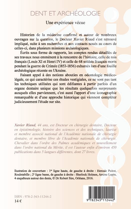 Écrits sous la forme de rapports, les comptes rendus détaillés des travaux du Docteur Xavier Riaud nous emmènent à la rencontre de l’histoire, celle de rois français (Louis XI et Henri IV) et celle de 68 soldats français morts pendant la guerre de Crimée (1853-1856) et exhumés lors d’une fouille archéologique récente en Ukraine. L’auteur fait ici appel à des notions abouties en odontologie médico-légale mais aussi à une iconographie et une approche historique remarquable qui complètent judicieusement l’étude sur site.