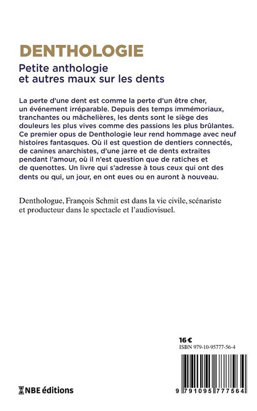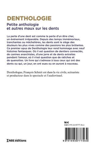 La perte d'une dent est comme la perte d'un être cher, un événement irréparable. Depuis des temps immémoriaux, tranchantes ou mâchelières, les dents sont le siège des douleurs les plus vives comme des passions les plus brûlantes. Ce premier opus de Denthologie leur rend hommage avec neuf histoires fantasques. Où il est question de dentiers connectés, de canines anarchistes, d'une jarre et de dents extraites pendant l'amour, où il n'est question que de ratiches et de quenottes. Un livre qui s'adresse à tous ceux qui ont des dents ou qui, un jour, en ont eues ou en auront à nouveau.